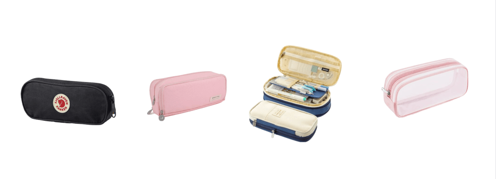 (From left to right) : Fjällräven Kånken Pen Case, pink pen pouch, blue pencil case, mesh pink case!
